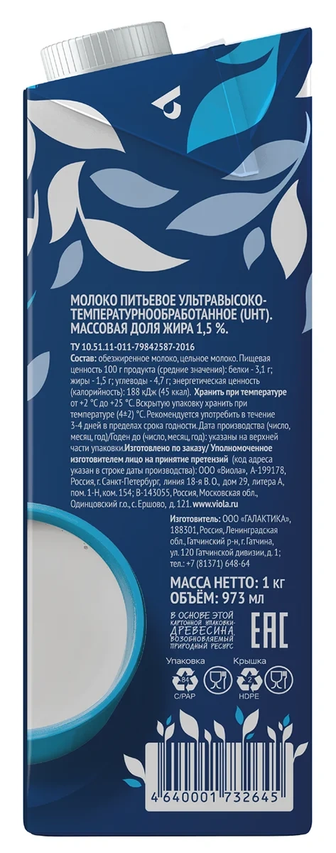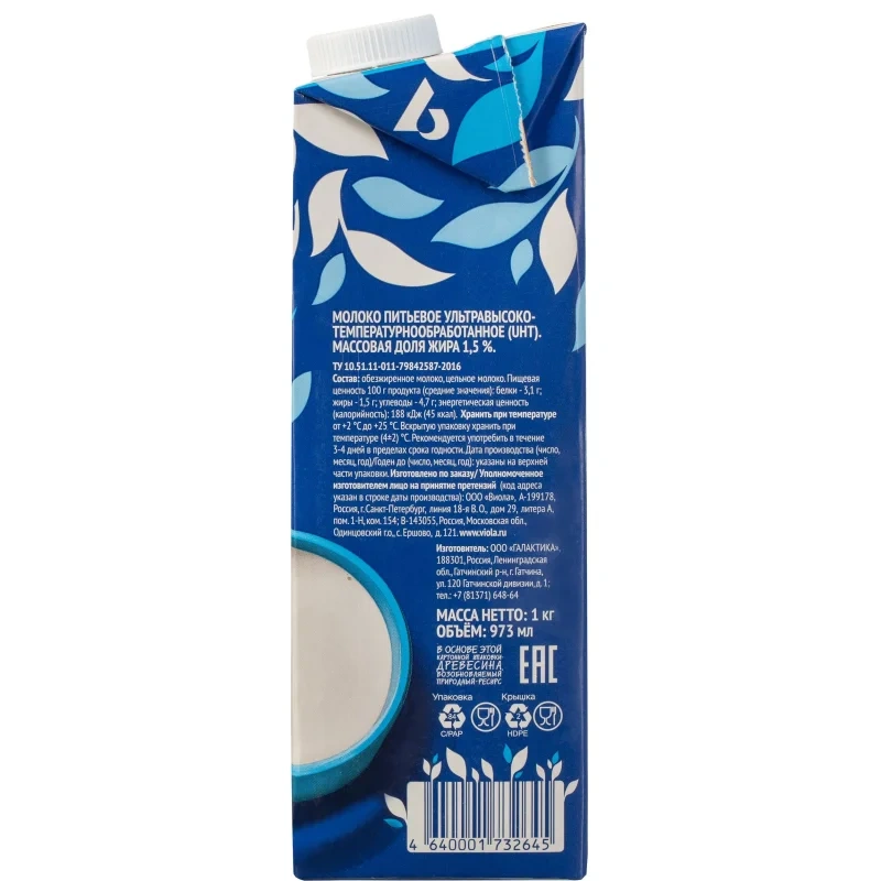 Молоко Viola стерилизованное 1.5%, 973мл