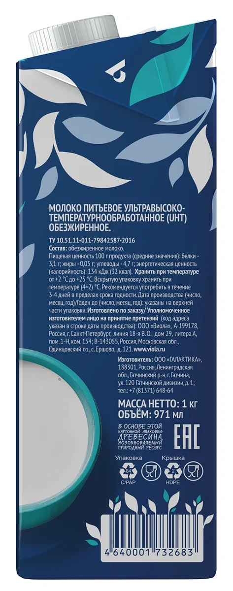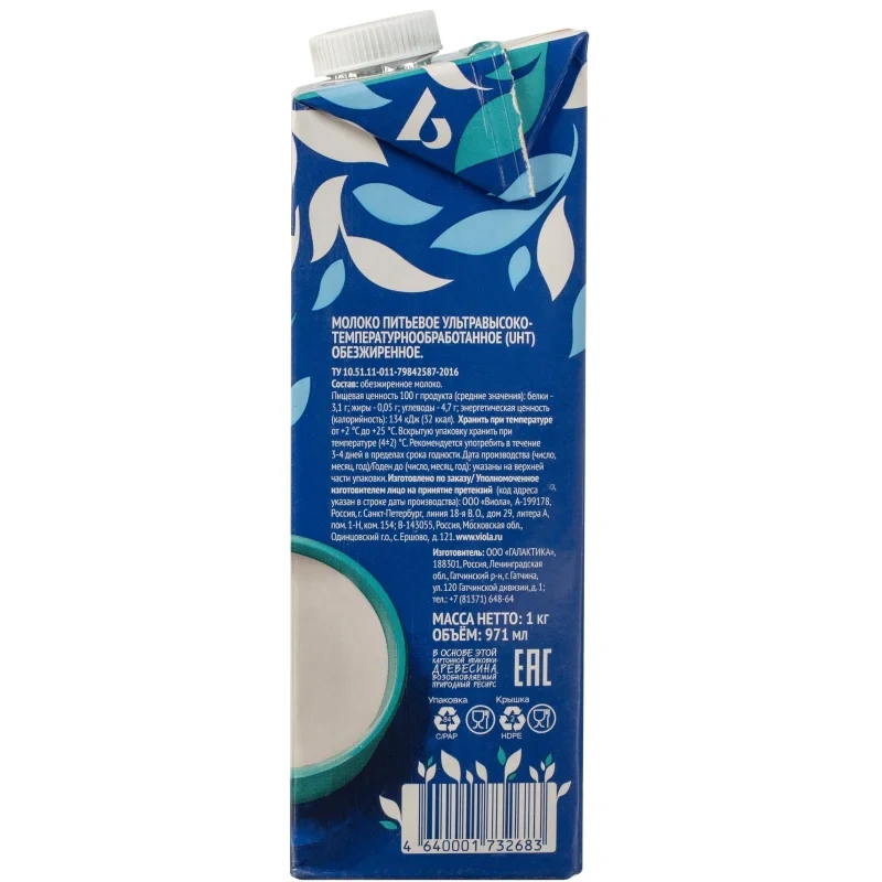 Молоко Viola 0.05%, стерилизованное, 973мл