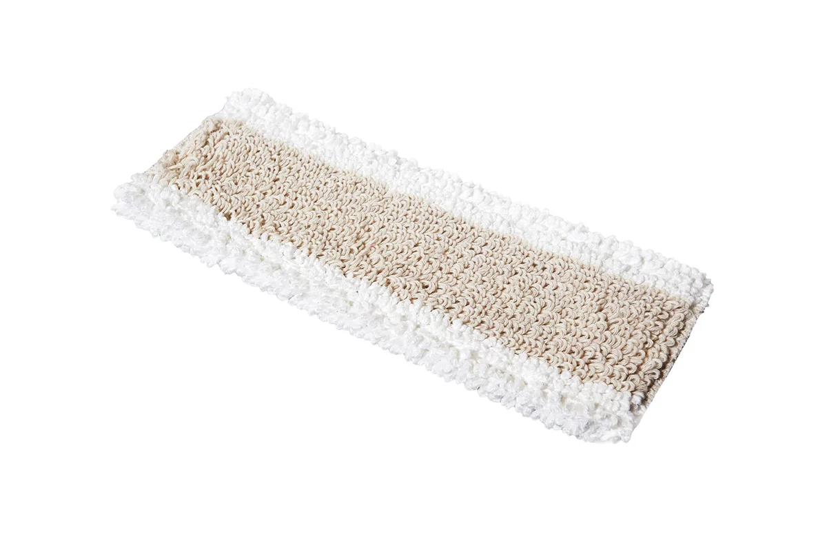 Обладает всеми преимуществами петельного мопа из хлопка. Добавление десяти рядов микрофибры по краям мопа делает уборку более легкой. Объемные волокна микрофибры хорошо оттирают грязь без дополнительных усилий. За счет меньшей плотности и большому содержанию хлопка в бежевой пряже — 80% хорошо поддается ручному отжиму.