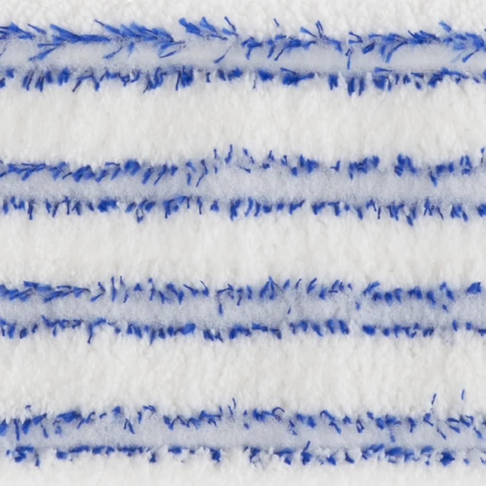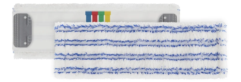 Белый микрофибровый плоский швабра с голубыми полосами, предназначена для интенсивного действия и поддержки из полиэстера. Система плоских швабр с микростворками подходит для использования с рулоном, челюстным или плоским отжимом. Идеально подходит для гладких или пористых внутренних полов с жирными загрязнениями.