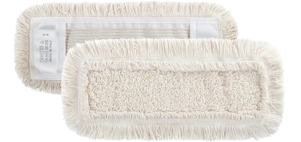 Тряпка для пола из хлопка, плетеная с использованием системы узловатого ворса, внутренняя петлевая кромка и внешняя обрезная кромка, полиэстеровая поддержка с карманами