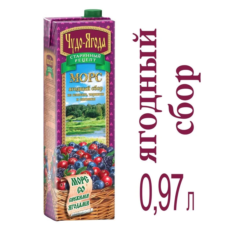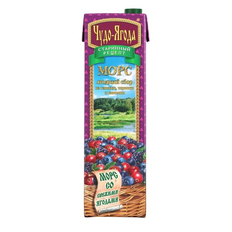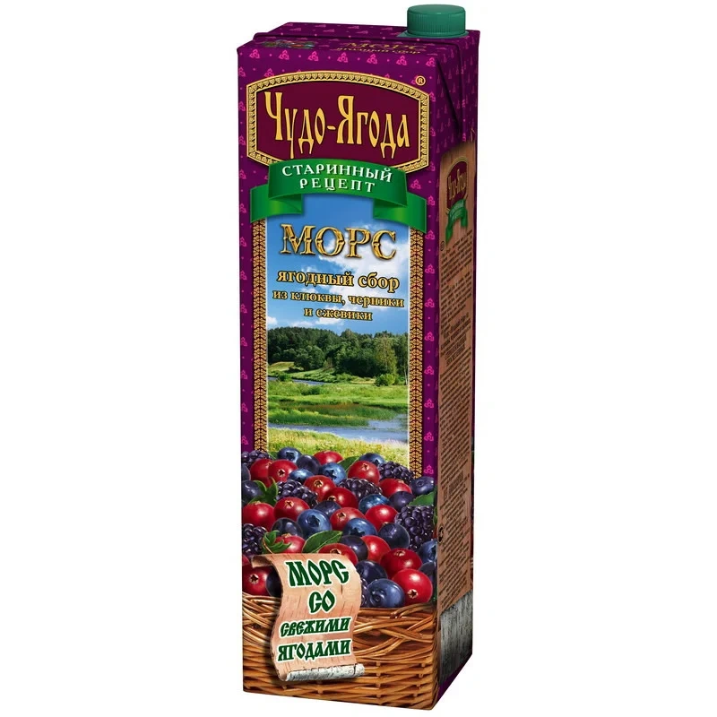 Морс Чудо-Ягода ягодный 0.97 л. Настоящий морс со свежими лесными ягодами. Кисло-сладкий сбор из клюквы, черники и ежевики сочетает многочисленные полезные свойства этих ягод. Отлично утоляет жажду и поддерживает здоровье. Для питания детей от трех лет. Тип упаковки: картонный пакет;