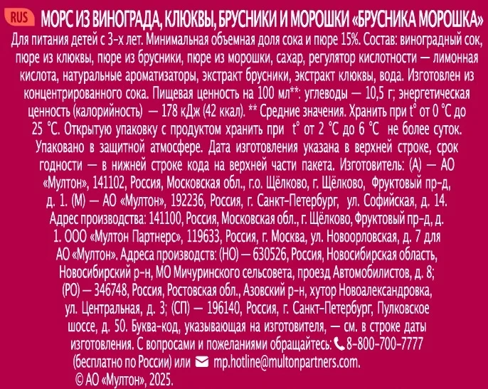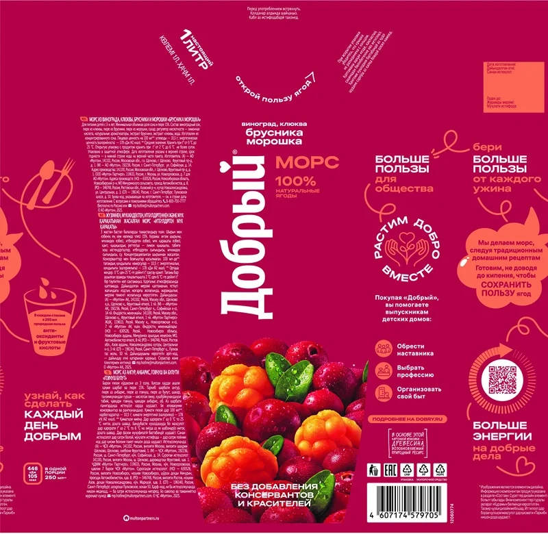 Морс Добрый с брусникой, морошкой, виноградом и клюквой, 1л x 12 шт обладает насыщенным терпким, натуральным вкусом морса из сочных лесных ягод. Богат антиоксидантами, которые замедляют процессы старения организма. Фруктовые кислоты улучшают пищеварение, помогают нормализовать микрофлору кишечника. Без консервантов и красителей, он наполнен пользой фруктов и вашей добротой.