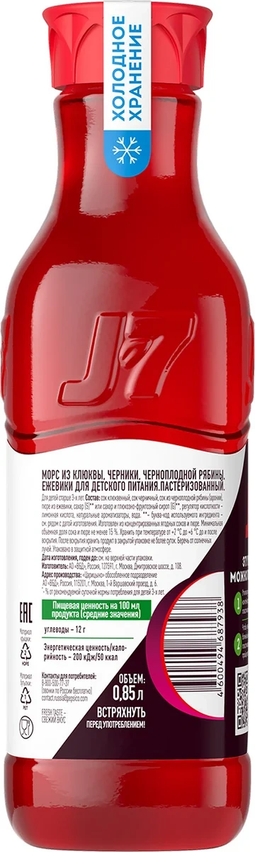 Морс J7 Fresh Taste из клюквы, черники, черноплодной рябины и ежевики. Произведен из натуральных ягод по щадящей технологии обработки. Хранить в холодильнике. Зарядись энергией и вкусом ягод вместе с J7! Это натуральный напиток из смеси ароматных ягод. Напиток можно легко и удобно взять с собой на прогулку, путешествие или пикник.