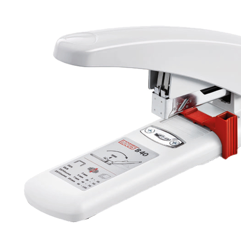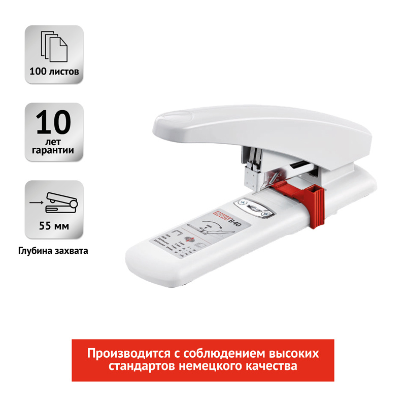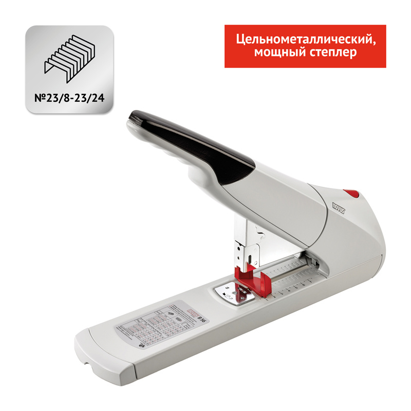 Мощный степлер со стильным дизайном. Сшивает до 100 листов плотностью 80г/кв.м. Имеет антиблокировочную систему (ABS) и верхний загрузочный механизм с двойной пружинной направляющей скоб. Механизм скрепления выполнен из прочного металла, а корпус из высококачественного пластика.