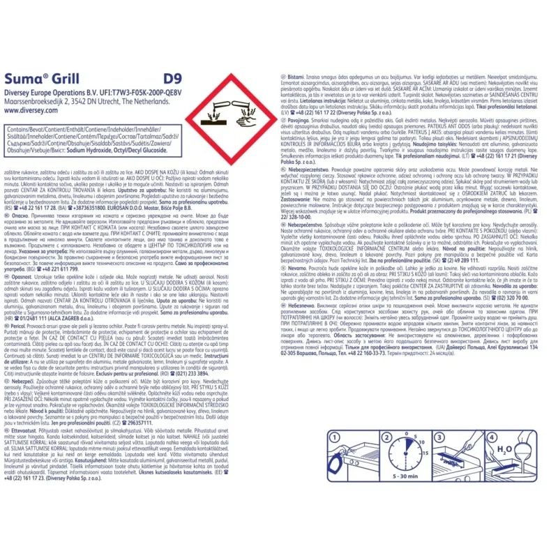 Способ применения: Чистка печей/грилей 1. Убедиться, что температура поверхности ниже 80°С (оптимальная температура 60-80°С). 2. Распылить неразбавленный продукт на поверхность или оборудование (рекомендуется использовать прилагаемый пенный распылитель с удлинительной трубкой). 3. Оставить на 5-30 минут в зависимости от загрязнения. 4. Удалить крупные загрязнения щеткой или металлической мочалкой. 5. Промыть чистой горячей водой и оставить самостоятельно высыхать. Чистка фритюрниц. 1. Смыть масло и закрыть клапан. 2. Наполнить водой емкость до уровня масла. 3. Добавить 1 л средства Suma Grill D9 на каждые 10 л воды (10%). Проверить уровень наполнения. 4. Включить фритюрницу и довести до контролируемого кипения на 15-30 минут. 5. После охлаждения и слива удалить оставшиеся загрязнения со стенок и нагревающих элементов металлической мочалкой или губкой. 6. Промыть дважды чистой горячей водой и оставить самостоятельно высыхать. Чистка вытяжек гриля. 1. Разобрать вытяжку гриля. 2. Поместить элементы вытяжки в раствор (50-100мл средства на 1л горячей воды (5-10% раствор)). 3. Оставить на 15-60 минут. 4. Тщательно промыть чистой водой и оставить самостоятельно высыхать. В соответствии с рекомендованными правилами применения средство Suma Grill D9 может использоваться на всех стандартных поверхностях из нержавеющей стали на кухнях. Запрещается использовать на материалах, не стойких к воздействию щелочной средой, например, алюминий, медь и т.д.