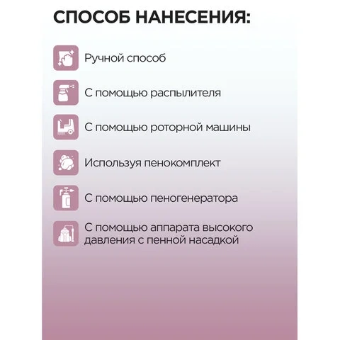 Рекомендуется применять в сфере профессионального клининга, на предприятиях пищевой и иных отраслей промышленности, в сфере общественного питания, в учебных, детских, дошкольных, школьных и медицинских учреждениях, гостинично-ресторанных, спортивных, развлекательных и торговых комплексах, на транспортных и ремонтных предприятиях, в общественных и административных зданиях, в быту.