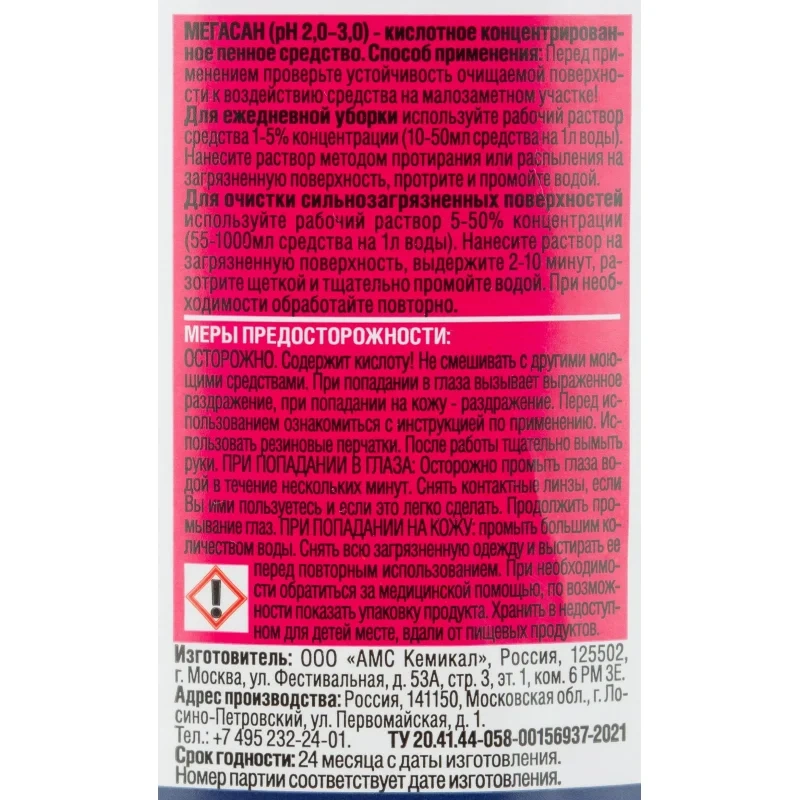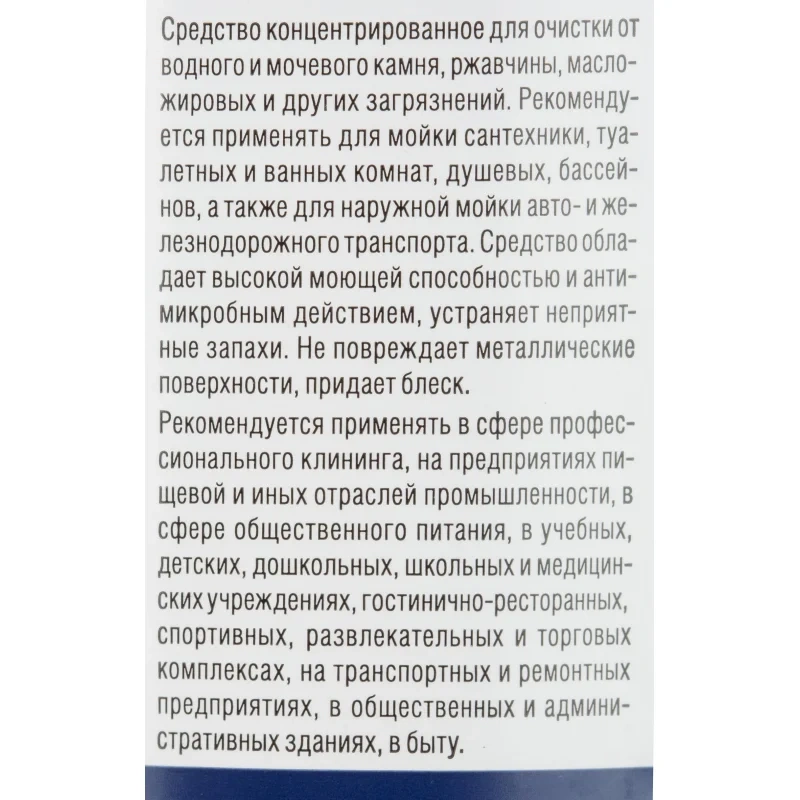 Средство кислотное концентрированное для очистки от водного и мочевого камня, ржавчины, масложировых и других загрязнений. Рекомендуется применять для мойки сантехники, туалетных и ванных комнат, душевых, бассейнов, а также для наружной мойки авто- и железнодорожного транспорта.