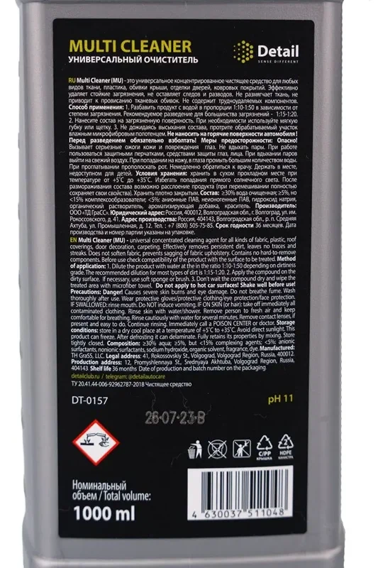 Универсальный очиститель интерьера автомобиляMulti Cleaner (MU) - это универсальное концентрированное чистящее средство для любых видов ткани, пластика, обивки крыши, отделки дверей, ковровых покрытий.Эффективно удаляет стойкие загрязнения, не оставляет следов и разводов.Не размягчает ткань, не приводит к провисанию тканевых обивок.Не содержит трудноудаляемых компонентов.pH: 11Состав:30% вода очищенная; 5%, но <15% комплексообразователи; <5%: анионные ПАВ, неионогенные ПАВ, гидроксид натрия, органический растворитель, ароматизирующая добавка, краситель.