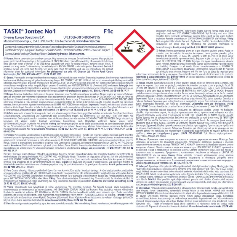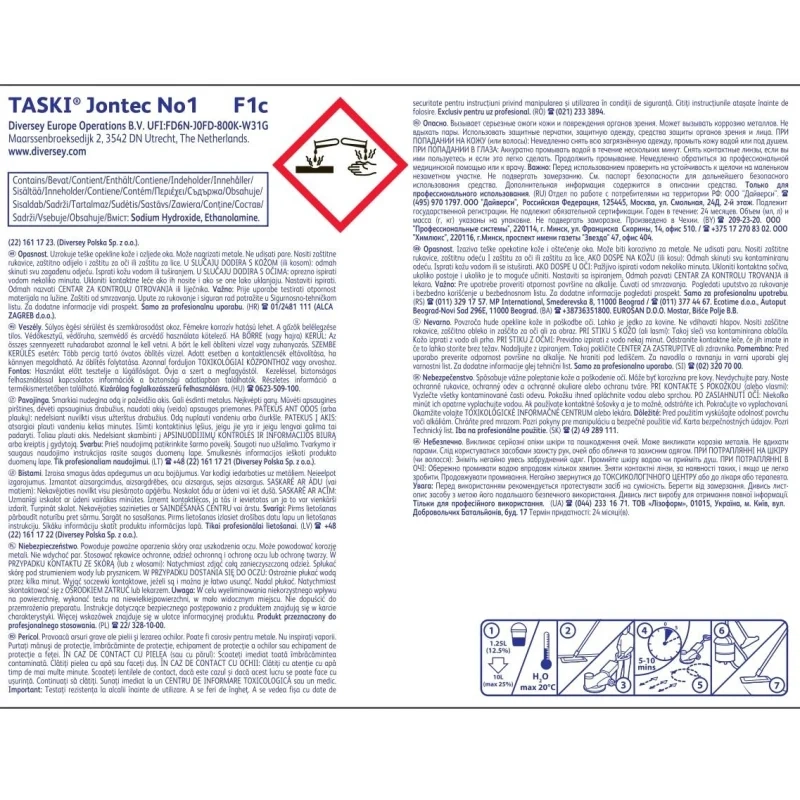 Средство для мытья полов Diversey Taski Jontec No 1 5 л (концентрат) Назначение: высокоэффективное средство быстро и эффективно удаляет эмульсию для пола с устойчивых к воздействию щелочи твердых полов, таких как полы из поливинилхлорида, винила, камня и т. д. Состав средства позволяет подготовить полы к новому покрытию без необходимости промывать пол, сокращая обычное время на удаление покрытия до 50%. Быстрое и легкое удаление эмульсии без промывки. Область применения: для применения на объектах ЖКХ, предприятиях общепита и пищевой промышленности, пищевых производствах, в торговле, ресторанах, столовых, объектах социального обеспечения, в гостиницах, офисах, образовательных учреждениях (включая школьные и дошкольные), ЛПУ, согласно рекомендациям производителя. Способ применения: минимальная дозировка 1 л на 10 л воды (10% / 1:10). При сильных загрязнениях увеличить концентрацию до 25%. Добавить необходимое количество средства в наполненный холодной водой бак/ведро, равномерно нанести раствор на загрязненную поверхность и оставить на 5 минут, чтобы он подействовал (не допускать, чтобы раствор высыхал). Затем протереть пол, используя однодисковую машину, оборудованную соответствующим полиэстровым диском, и произвести уборку раствора при помощи водососа. Протереть пол влажной шваброй, чтобы удалить остатки. Перед повторным нанесением покрытия подождать, пока пол полностью высохнет. При использовании раствора высокой концентрации, тереть пол не требуется. При обработке труднодоступных участков, использовать 25 % раствор, швабру и ведро, оставить раствор на 10 минут, чтобы он подействовал, и удалить при помощи водососа. Тереть пол не требуется. Использовать только с холодной водой. При обработке пористых и структурированных полов, тщательно их промывать. Не использовать средство для обработки полов, чувствительных к воздействию щелочей, например натурального линолеума, пробки, и дерева. Не использовать средство для обработки чувствительных к растворителю покрытий, например асфальта. Немедленно удалять мокрой тряпкой все брызги раствора, попадающие на чувствительные к воздействию щелочей поверхности (например, деревянные плинтуса, окрашенные/лаковые поверхности). Перед применением проверять средство на совместимость с обрабатываем материалом на маленьком, незаметном участке. Состав: вода (мягкая), алкоксилат спирта (C12-18) (EO/PO), 3Na-соль метилглициндиуксусной кислоты, моноэтаноламин, Na-соль кумолсульфоновой кислоты, гидроксид натрия, бутиловый эфир. Срок годности: 2 года с момента производства (при соблюдении условий хранения, рекомендованных производителем.
