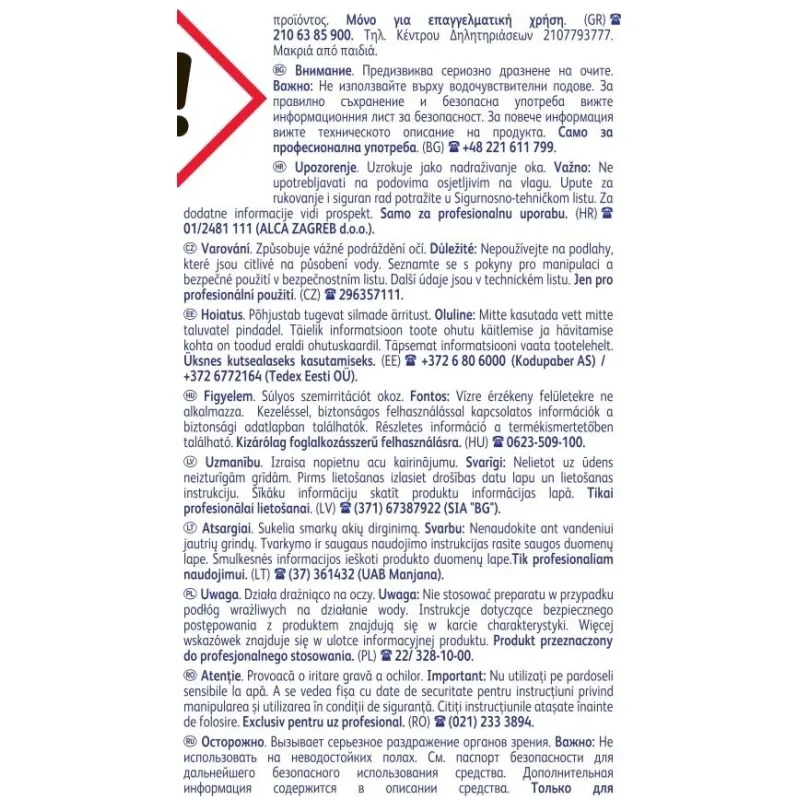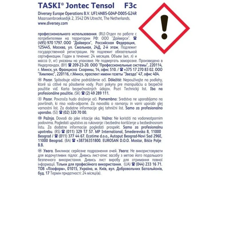 Средство для машинной и ручной мойки поверхностей Diversey Taski Jontec Tensol 5 л (концентрат) Назначение. Предназначено для ухода за защищенными и незащищенными твердыми водостойкими полами. Идеально подходит для напольных покрытий нового поколения (полиуретановые полы/предварительно обработанные полы). Очищает и поддерживает чистоту, оставляет ненаращиваемую защитную пленку, препятствующую скольжению и не позволяющую грязи приставать к полу. Подходит для ручной влажной уборки (удаления пыли) и для уборки однодисковой машиной с использованием распылителя.Область применения. Для применения на объектах ЖКХ, предприятиях общепита и пищевой промышленности, пищевых производствах, в торговле, ресторанах, столовых, объектах социального обеспечения, в гостиницах, офисах, образовательных учреждениях (включая школьные и дошкольные), ЛПУ, согласно рекомендациям производителя. Способ применения. Спрейная бутылка: 100 мл / 500 мл воды (20%). Ведро (минимальная дозировка): 25 мл на 5 л (0.5%), максимум 2%. Влажная уборка: 25/500 мл (5%). Первичная обработка: 1,25/5 л (20%), максимум 50% (пористый пол). Поломоечная машина: 50 мл / 10 л (0,5%), максимум 2%. При влажной уборке вручную: Добавить необходимое количество средства в ведро, наполненное водой, нанести раствор на загрязненную поверхность, при необходимости оставить на некоторое время, чтобы средство подействовало, и удалить загрязнившийся раствор. Метод орошения: Добавить необходимое количество средства в бутылку с распылителем, наполненную водой. Распылить небольшое количество моющего раствора на моп, протереть пол. Регулярно промывать или заменять моп на чистый. При уборке с помощью поломоечной машины: Добавить необходимое количество средства в заполненный водой бак поломоечной машины, нанести раствор на загрязненную поверхность, промыть пол и удалить загрязнившийся раствор. При помощи однодисковой машины, оборудованной распылителем и красным полиэстровым диском: Добавить необходимое количество средства в распылитель и обработать пол. Отполировать для придания большего. При первичной обработке: Добавить необходимое количество средства в ведро, наполненное водой, нанести раствор на загрязненную поверхность при помощи чистой швабры, дать высохнуть. Отполировать для придания большего блеска. Не использовать на чувствительных к воде материалах, таких как дерево или пробка. Перед использованием проверить совместимость на небольшом незаметном участке. Состав: вода (мягкая), этоксилат спирта (C 9-11) (6EO), натриевая соль 1,2-бензизотиазолин-3-она, этоксилат спирта (C13) (12-13EO), 2-феноксиэтанол, жирная (пальмоядровая) кислота, гидроксид натрия, Na-соль кумолсульфоновой кислоты, этоксилат спирта (C13) (8-9EO), алкоксилат спирта, лимонная кислота, отдушка, краситель. Срок годности: 2 года с момента производства (при соблюдении условий хранения, рекомендованных производителем.