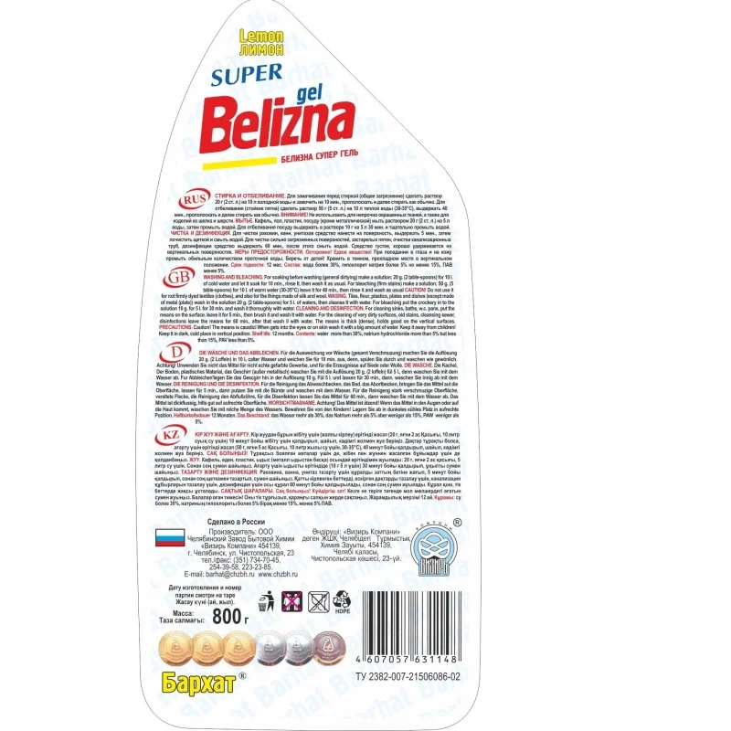 Средство для сантехники Super Belizna 800 мл Назначение: Универсальный гель Белизна традиционное отбеливающее и дезинфицирующее средство. Предназначено для отбеливания и удаления пятен с хлопчатобумажных, льняных тканей. Способ применения: Для отбеливания белья: развести 60-80 мл средства в 10 л воды, замочить белье на 30-35 минут, выстирать и тщательно прополоскать. Для чистки и дезинфекции санузлов: нанести средство на загрязненный участок на 5-7 минут, потереть щеткой и смыть водой. Для мытья полов и сантехники: развести 100 мл средства в 10 л воды, вымыть поверхность, смыть водой и протереть влажной тряпкой. Для дезинфекции эмалированной, фарфоровой, фаянсовой посуды: развести 100 мл средства в 1 л холодной воды, оставить посуду в полученном растворе на 30-60 минут, затем тщательно промыть водой. Дезинфицирует и устраняет запахи. Легко удерживается на вертикальных поверхностях. Меры предосторожности: При попадании в глаза и на кожу вызывает раздражение. При работе использовать щетку или резиновые перчатки. При попадании средства в глаза и на кожу - тщательно промыть большим количеством воды. При необходимости обратиться к врачу. Состав: вода более 30%, гипохлорит натрия более 5%, но менее 15%, ПАВ менее 5%. Условия хранения: Хранить в плотно закрытой упаковке, отдельно от пищевых продуктов, в недоступных для детей местах. Средство замерзает, после размораживания сохраняет свои свойства. По истечении срока годности средство и упаковку утилизируют как бытовой отход. Срок годности: 12 месяцев.