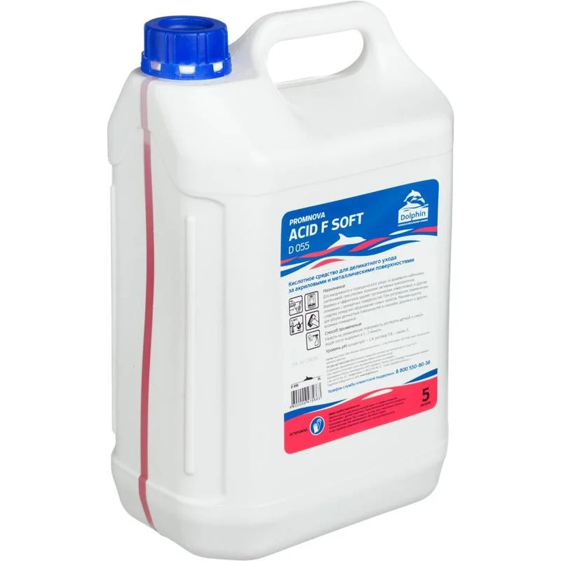 Средство для мытья сантехники и кафеля Dolphin Promnova Acid F Soft 5л. Назначение: для ежедневного и периодического ухода за душевыми кабинами, сантехникой, смесителями.