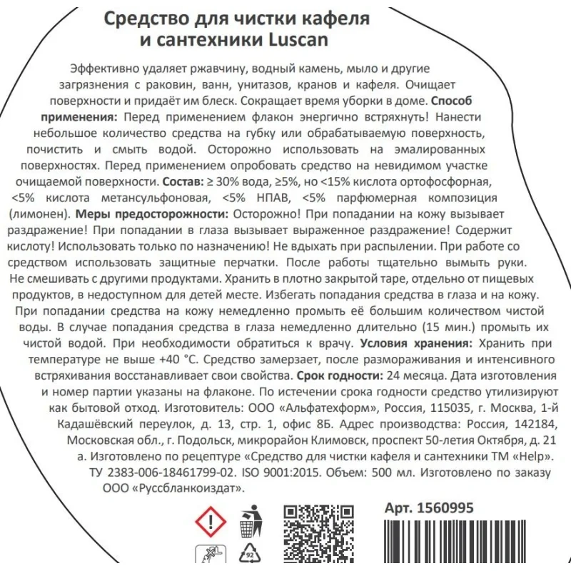Состав: ≥30% вода; ≥5%, но <15% кислота ортофосфорная; <5% кислота метансульфоновая; <5% НПАВ; <5% парфюмерная композиция (лимонен).
