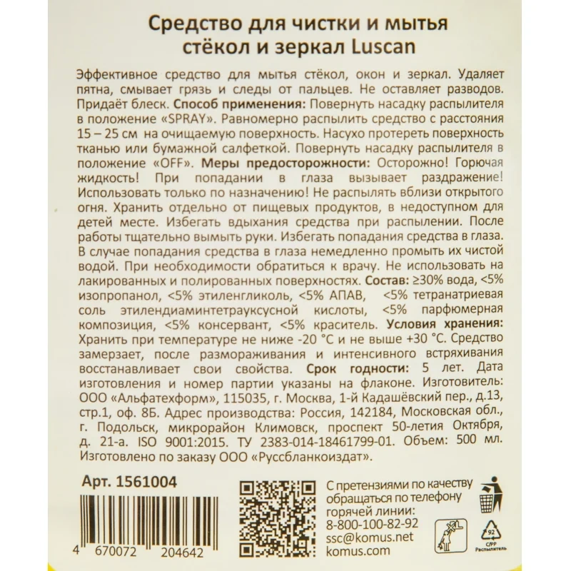 Назначение. Средство для мытья стёкол, окон, зеркал Luscan эффективно очищает стекла и окна от пыли и грязи, не оставляя разводов и пятен. Средство оставляет после себя блеск на окнах и стёклах.