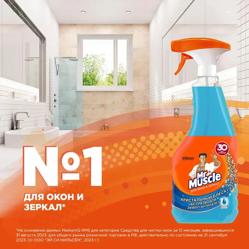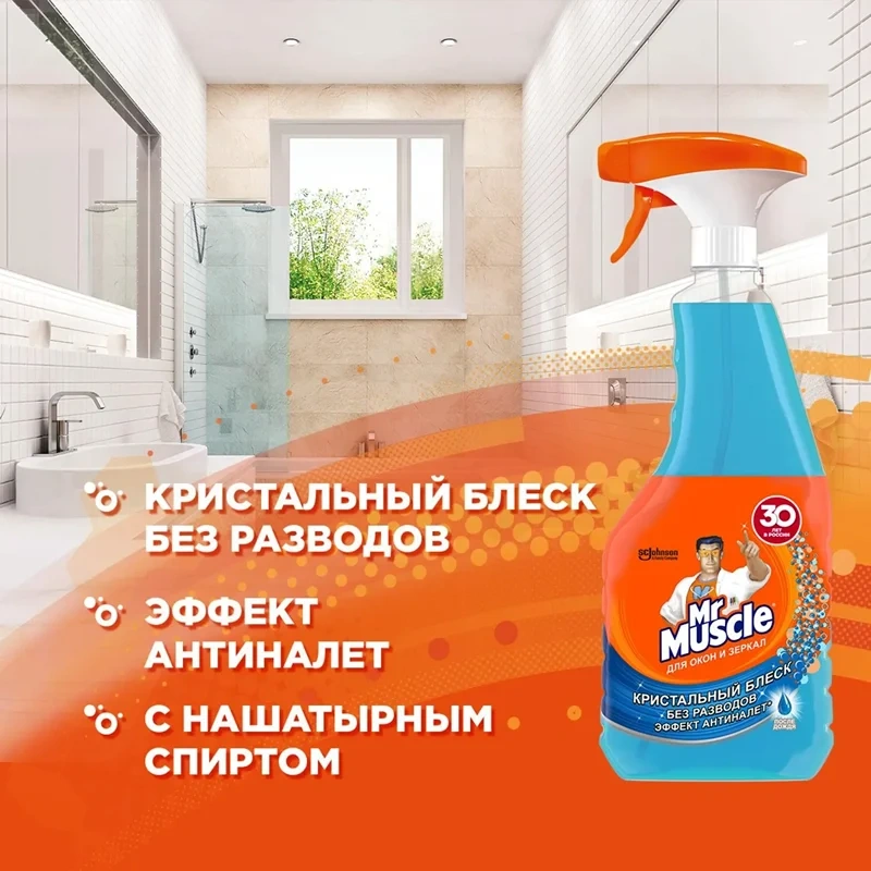 Назначение: Мистер Мускул средство для стекол и поверхностей не только очистит стекла и зеркала до блеска, но и легко справится с очищением других поверхностей - кафеля, ламината, пластика, стальных и хромированных поверхностей, обработанного мрамора и гранита. Средство содержит нашатырный спирт, который эффективно удаляет грязь, жир, сажу, минеральные масла с поверхностей. Улучшенная форма носика распылителя позволяет одним движением наносить средство на большую поверхность. Чистота и блеск без разводов.