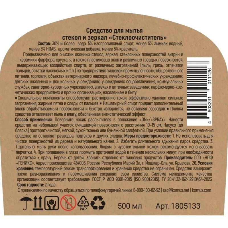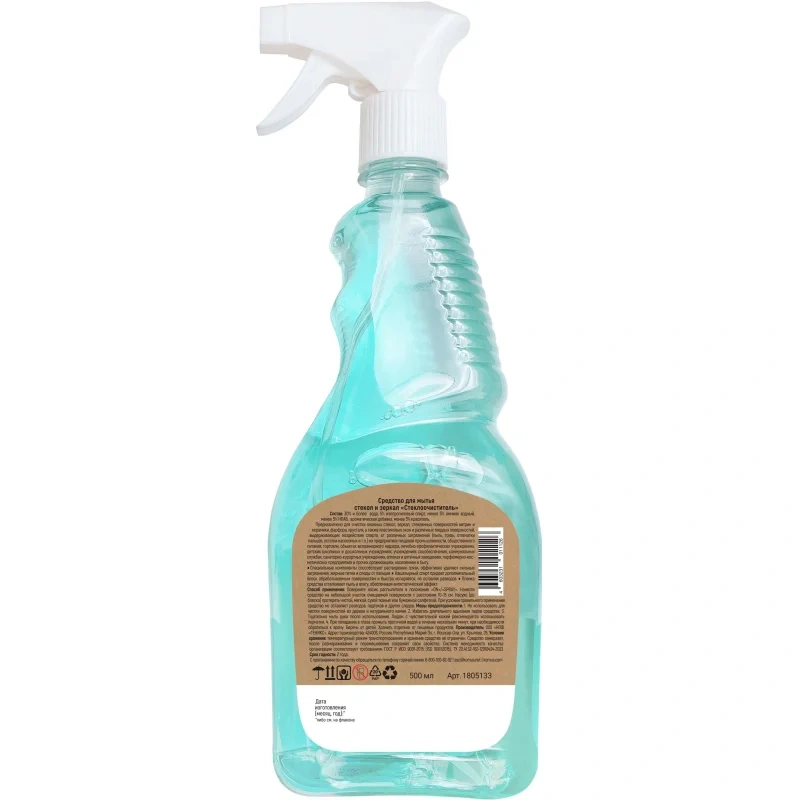 Назначение: стеклоочиститель предназначен для чистки оконных стёкол, зеркал, стеклянных поверхностей витрин и витражей, кафеля, керамики, фарфора, хрусталя, а также пластиковых окон и твёрдых полимерных поверхностей от различных видов загрязнений (пыль, грязь, отпечатки пальцев, остатки насекомых) в лечебно-профилактических учреждениях, предприятиях общественного питания, пищевой промышленности, детских школьных и дошкольных учреждениях, учреждениях соцобеспечения, санаторно-курортных учреждениях, а также населением в быту. В состав входит триклозан, что обеспечивает антибактериальный эффект. Специальные компоненты способствуют растворению грязи, эффективно удаляя сильные загрязнения, жирные пятна и следы от пальцев. Нашатырный спирт придаёт дополнительный блеск обрабатываемым поверхностям и быстро испаряется, не оставляя разводов. Плёнка средства отталкивает пыль и влагу, обеспечивая антистатический эффект.