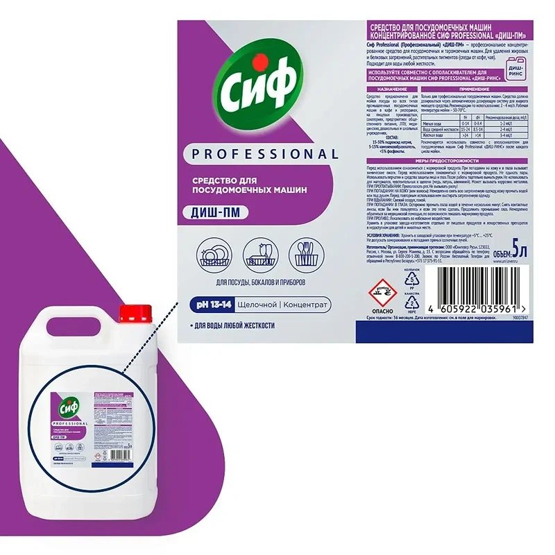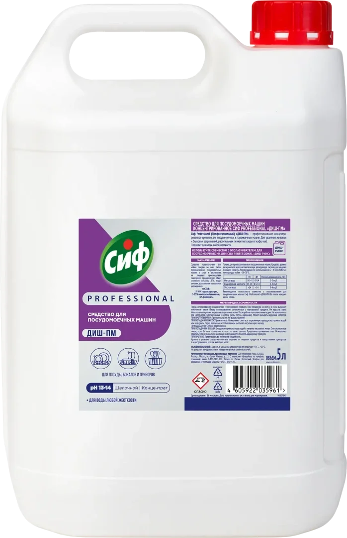 Сиф Professional (Профессиональный) «ДИШ-ПМ» - профессиональное концентрированное средство для посудомоечных и таромоечных машин. Для удаления жировых и белковых загрязнений, растительных пигментов (следы от кофе, чая). Подходит для воды любой жесткости. Только для профессиональных посудомоечных машин. Средство должно дозироваться через автоматическую дозирующую систему для жидкого моющего средства.Рекомендации по использованию: 2 - 4 мл/л. Рабочая температура мойки – 50-70°С.Срок годности: 36 мес.