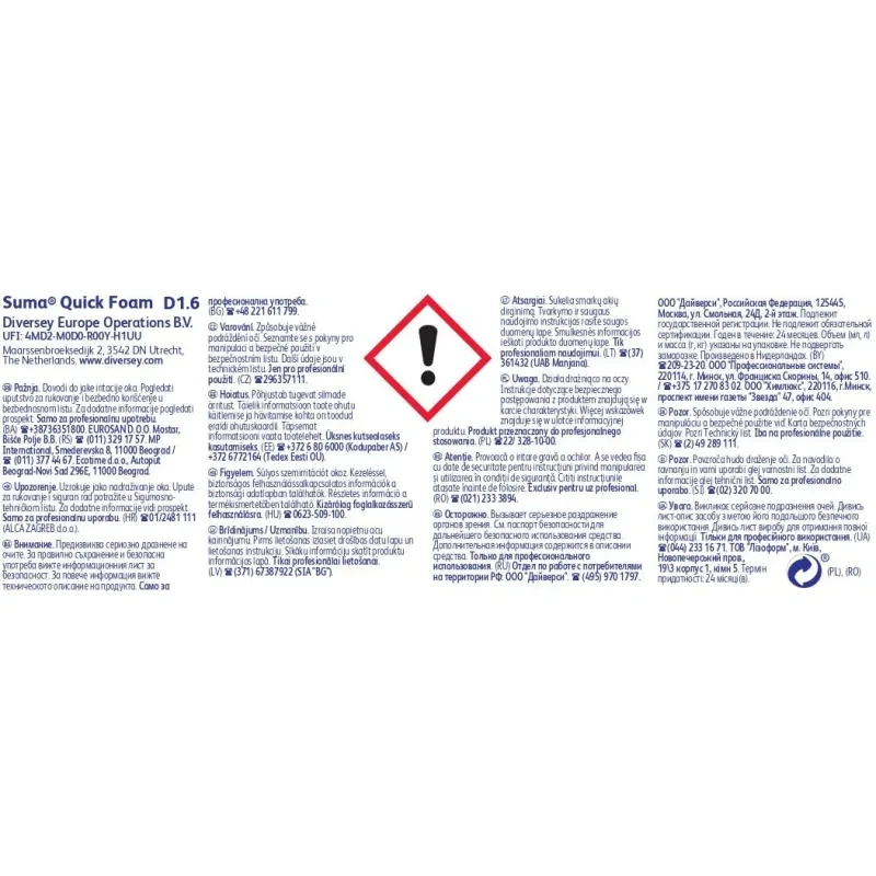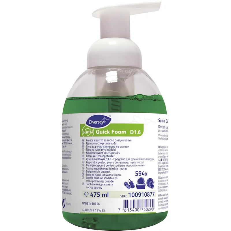 Средство для мытья посуды Diversey Suma Quick Foam D1.6 475 мл (концентрат) Назначение: средство Suma Quick Foam D1.6 является концентрированным нейтральным пенным моющим средством для ручного мытья всех типов столовой посуды. Данный продукт обладает оптимальным сочетанием поверхностно-активных веществ, позволяющих эффективно удалять жир и засохшие остатки пищи. Средство легко смывается и не оставляет разводов на поверхности посуды. Экономично в использовании, благодаря концентрированной формуле и специальной помпе-дозатору. Не требует замачивания. Область применения: для применения на объектах ЖКХ, предприятиях общепита и пищевой промышленности, пищевых производствах, в торговле, ресторанах, столовых, объектах социального обеспечения, в гостиницах, офисах, образовательных учреждениях (включая школьные и дошкольные), ЛПУ, согласно рекомендациям производителя. Способ применения: однократно нажать на помпу-дозатор, чтобы нанести средство на ручной пад или щетку. Вымыть посуду с помощью ручного пада или щетки. Тщательно ополоснуть и оставить самостоятельно высыхать. Для удаления сильных загрязнений увеличить дозировку Состав: вода, алкилбензолсульфокислота, алкил (C12-14) (3EO) серная кислота Na-соль, лимонная кислота, гидроксид натрия, краситель, отдушка. Срок годности: 2 года с момента производства (при соблюдении условий хранения, рекомендованных производителем.