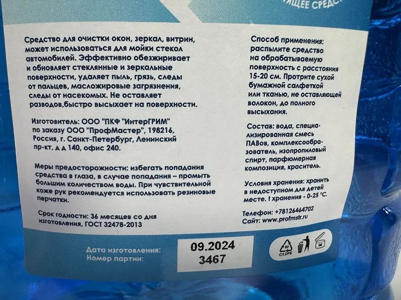 Средство для мытья стекол, зеркал, витрин, светильников, стекол автомобиля и других стеклянных, металлических, пластиковых, окрашенных и т.п. поверхностей. Удаляет уличные, бытовые, легкие жировые и другие загрязнения. Не оставляет разводов. Имеет приятный запах. Рекомендуется для мытья витрин и стеклянных фасадов.