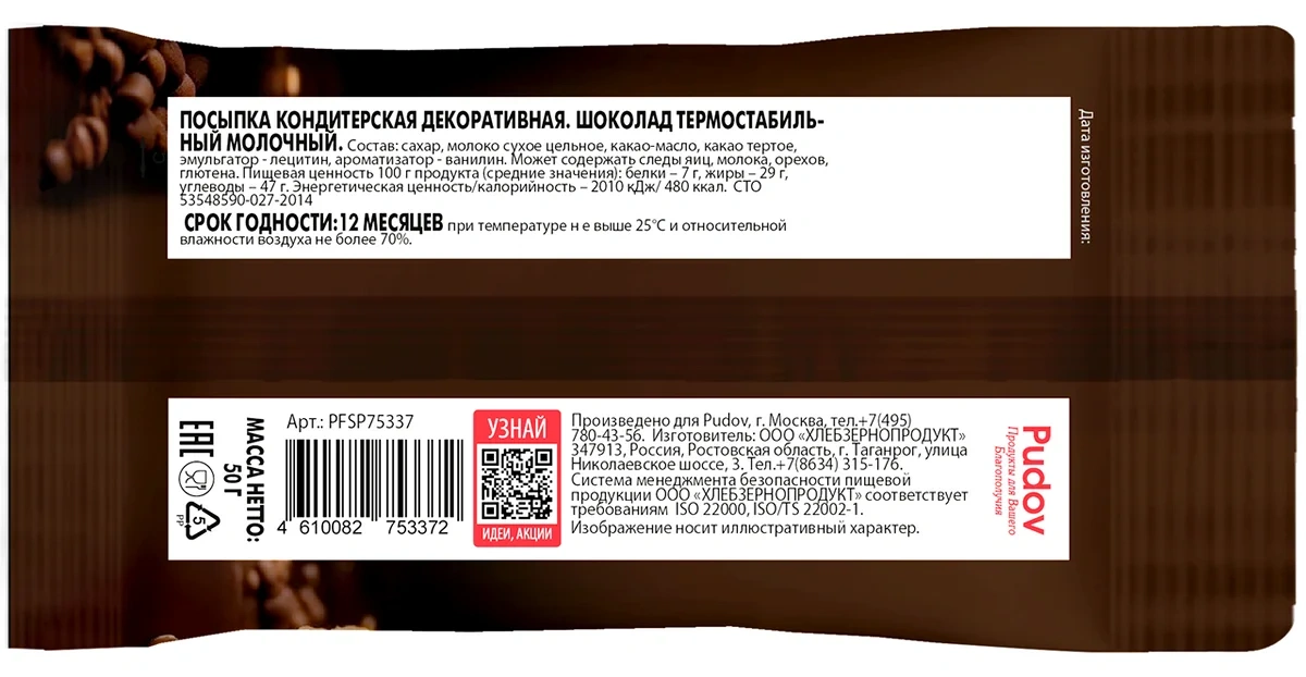 Шоколад С.Пудовъ молочный термостабильный, 50г