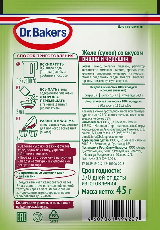 Желе Dr.Bakers со вкусом вишни и черешни, 45г