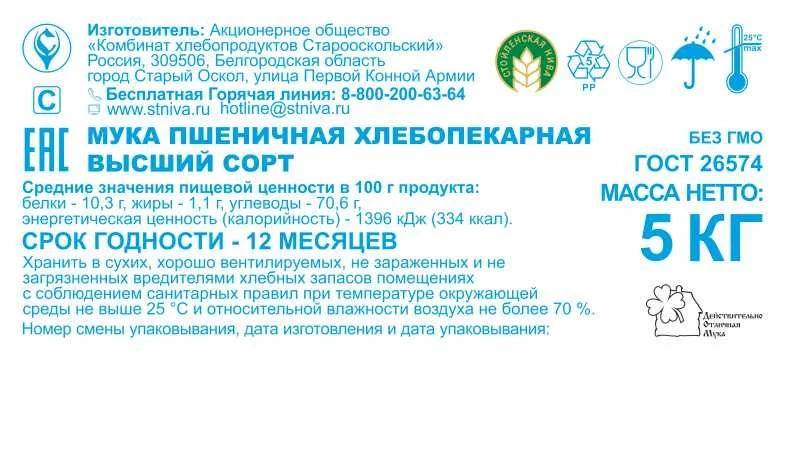 Мука Славна бело-нежная пшеничная хлебопекарная высший сорт ГОСТ, 5кг
