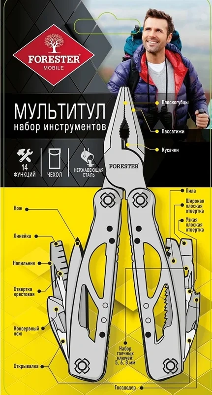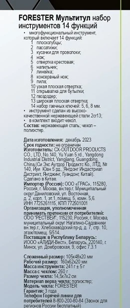 Многофункциональный инструмент, который включает 14 функций: плоскогубцы; пассатижи; кусачки для проволоки; нож; отвертка крестовая; напильник; линейка; консервный нож; пила; узкая плоская отвертка; открывалка для бутылки; гвоздодер; широкая плоская отвертка; набор гаечных ключей: 5, 6, 8мм. Инструмент сделан из высоко-качественной нержавеющей стали 2cr13; в комплект входит чехол. Размер в сложенном виде: 105х48х20мм. Размер в рабочем состоянии: 160х62х20мм. Масса инструмента: 241г 5г. Масса с чехлом: 260г. Размер чехла: 14,5х7х2см.