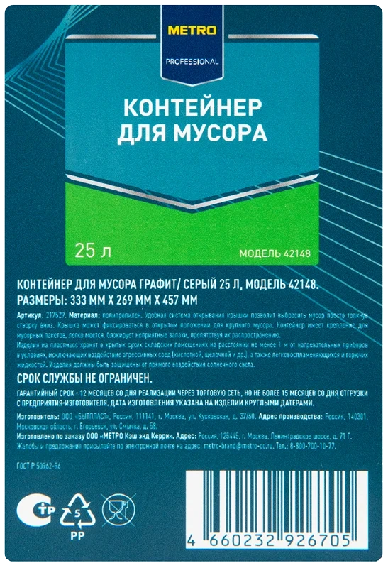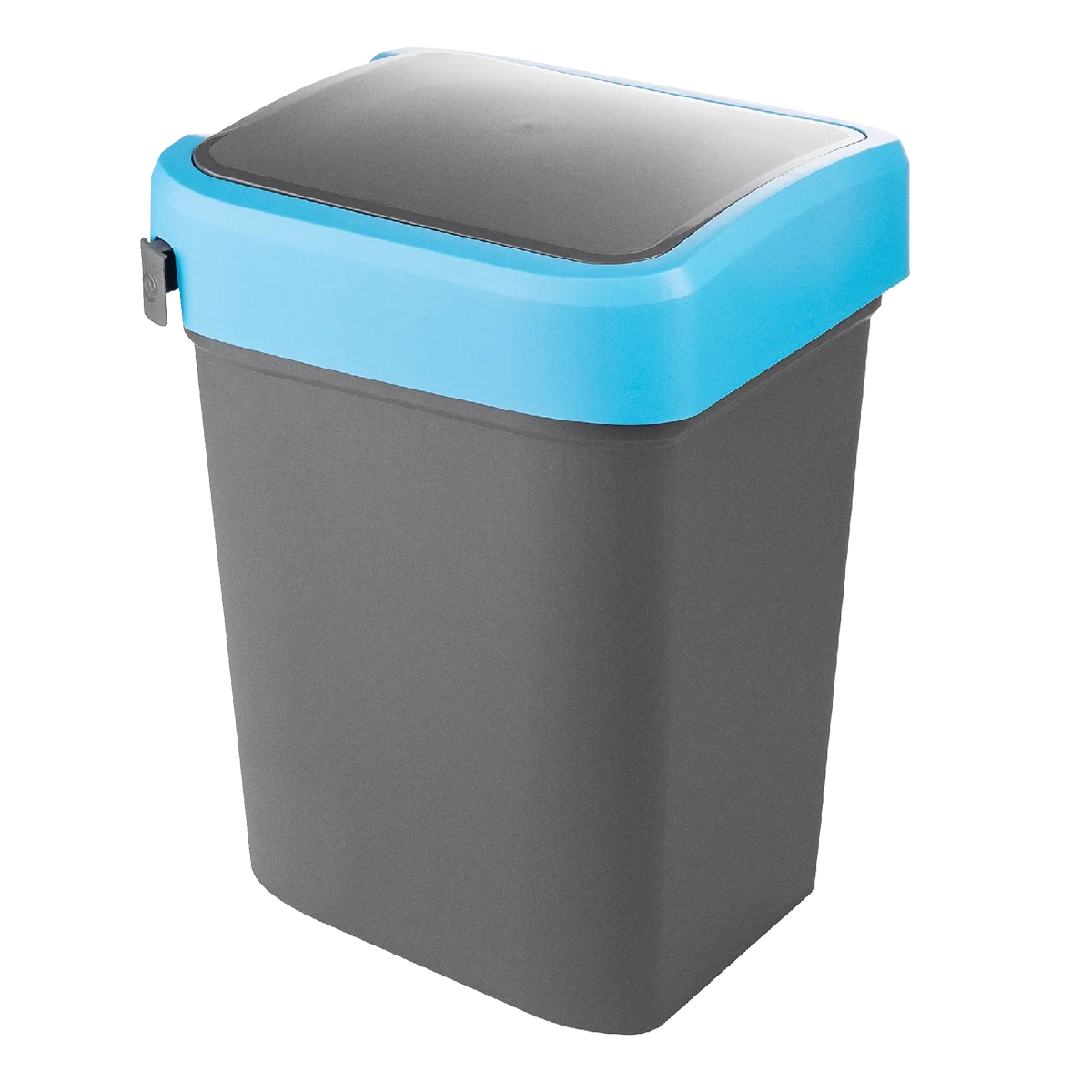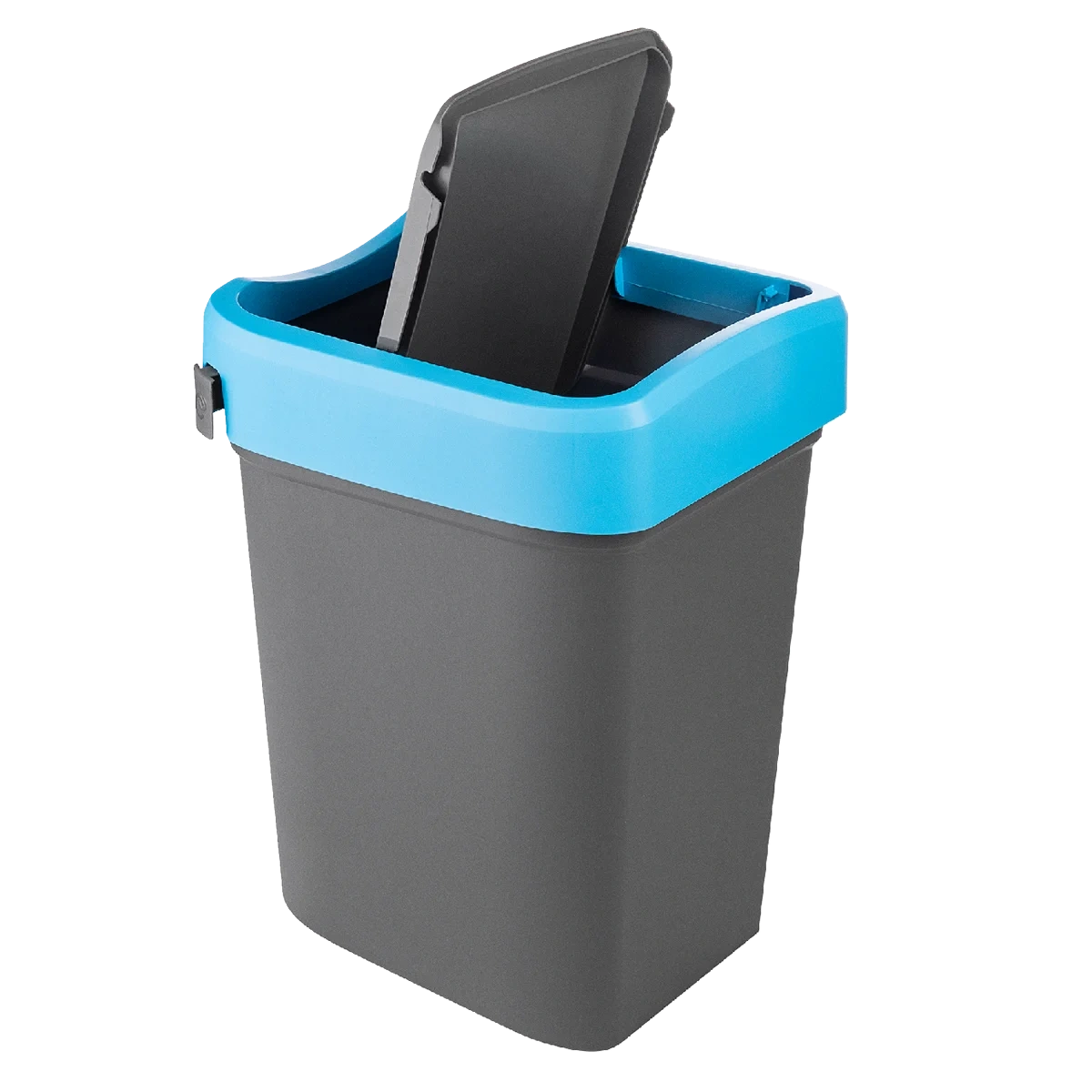 METRO PROFESSIONAL Контейнер для мусора графитно-синий, 33 x 27 x 46 см, 25 л изготовлен из прочного пластика. Удобная система открывания крышки позволит выбросить мусор в ведро даже с занятыми руками, просто толкнув створку вниз. Крышка может фиксироваться в открытом положении для крупного мусора. Цветовая дифференциация ободов незаменима для организации раздельного сбора мусора дома. Контейнер для раздельного сбора мусора имеет специальное крепление для мусорных пакетов, легко моется, блокирует неприятные запахи, препятствуя их распространению. Контейнер отлично подойдет для использования в офисе и гармонично впишется в современный домашний интерьер.