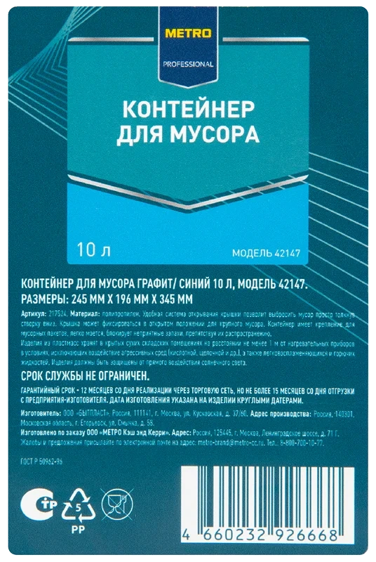METRO PROFESSIONAL Контейнер для мусора графитно-зеленый, 25 x 20 x 35, 10 л изготовлен из прочного ...