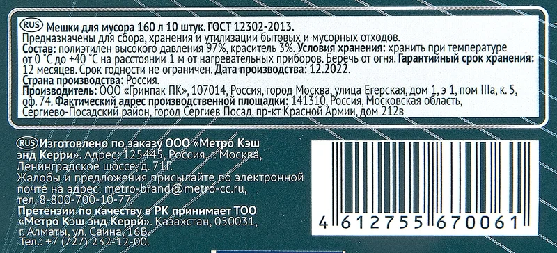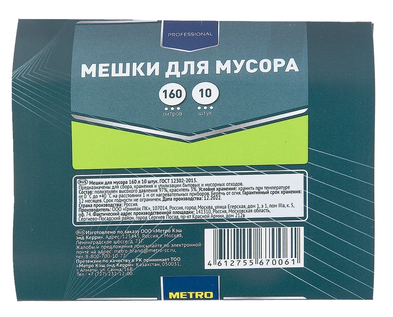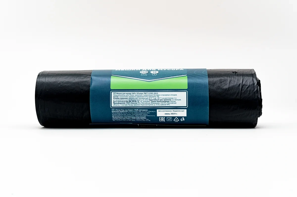 METRO PROFESSIONAL Мешки для мусора без тесемок 25мкм 80х110см 160л, 10шт