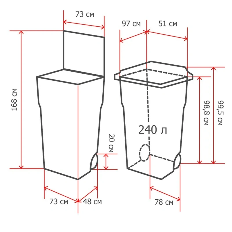 Контейнер-бак мусорный 240 л пластиковый на 2-х колесах с крышкой зеленый Мусорный контейнер для хранения и транспортировки производственных и хозяйственно-бытовых отходов, 240 л. Крышка повышенной прочности предотвращает попадание влаги внутрь контейнера, ограничивает доступ животных и насекомых, предотвращает распространение запахов разложения отходов. Есть ручки. Обрезиненные колеса облегчают перемещение контейнера. Дополнительные ребра жесткости оси. Есть держатель для пакета. Усиленное дно. Высота контейнера-бака: 106 см Размер по верхней кромке: 48x58 см Ширина: 58 см Диаметр колес: 200 мм Материал: : пластик (высокая ударопрочность и износостойкость; устойчивость к ультрафиолетовым лучам, выцветанию, агрессивным моющим веществам; выдерживает большие нагрузки; возможно использование при низких и высоких температурах от -40С до + 60С). Цвет: зеленый Вес: 13,5 кг Оттенок цвета может отличаться в зависимости от партии товара.Внимание: в характеристике 'Объем рекомендуемого мешка' указан минимальный объем мешка, который подойдет для изделия. Рекомендуется приобретать мешки указанного, либо большего объема.Законодательные и технические документы: