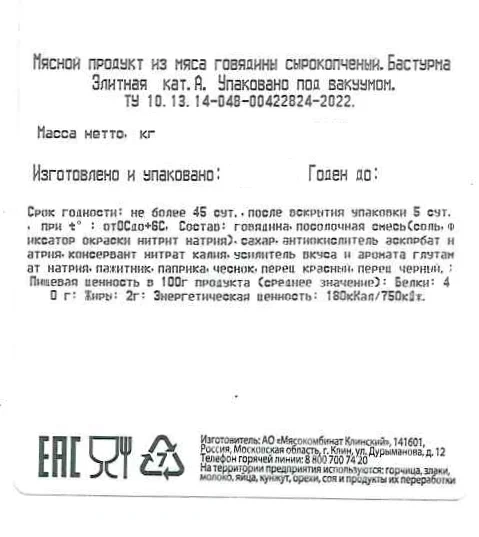 Бастурма из говядины Клинский Элитная сырокопченая, ~200г