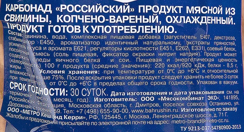 METRO Chef Карбонад Российский варено-копченый, ~1.7кг