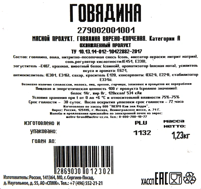 METRO Chef Говядина Деликатесная варено-копченая, 500г