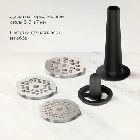 В комплект входят насадки для фарша (3, 5 и 7 мм), для колбасок и кеббе.