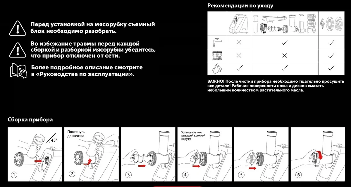 | Комплектация | мясорубка – 1 шт.; стальная решетка (5 мм и 7 мм) – 2 шт.; лоток для мяса – 1 шт.; толкатель пластик |