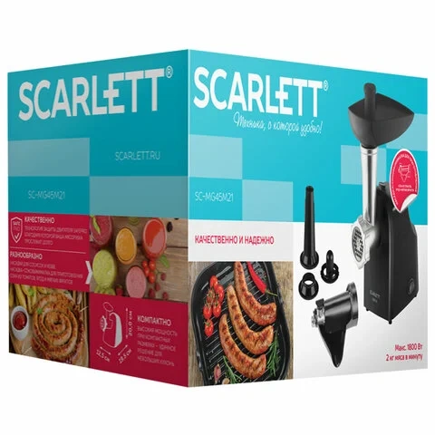 Мясорубка SCARLETT SC-MG45M21, 1800 Вт, производительность 2 кг/мин, 3 насадки, реверс, пластик, чер