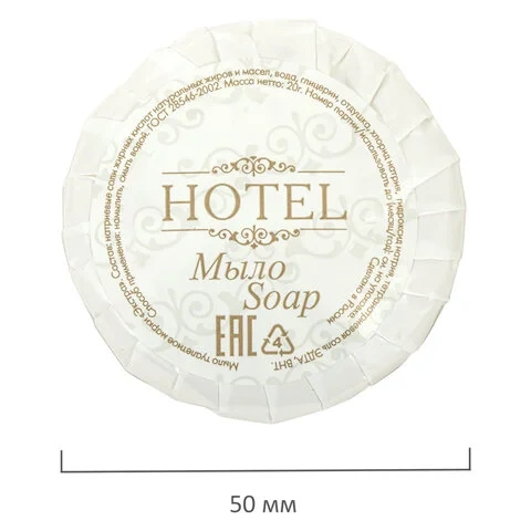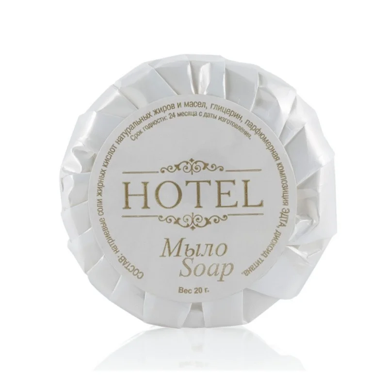 Мыло 20 г, гофре. Состав: натриевые соли жирных кислот натуральных жиров и масел, глицерин, диоксид титана, парфюмерная композиция ЭДТА. Материал упаковки - пленка БОПП. Количество в коробе - 300 штук. Срок годности - 24 месяца.