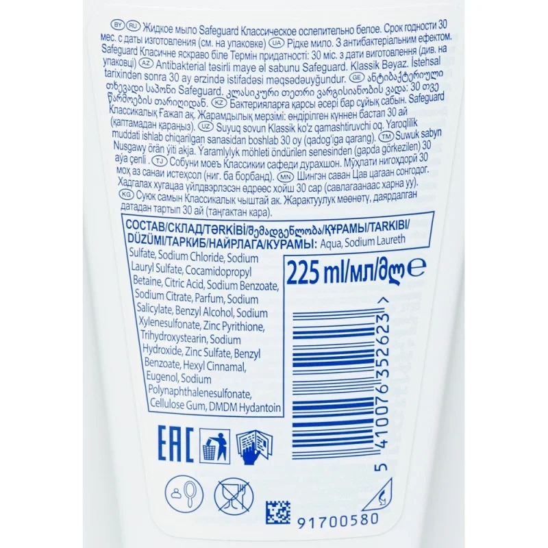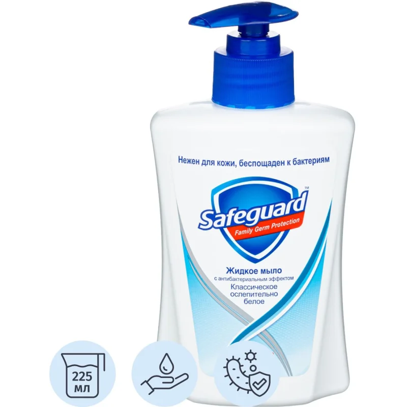 Жидкое мыло с дозатором Safeguard 225мл, Ослепительно белое, антибактериальное