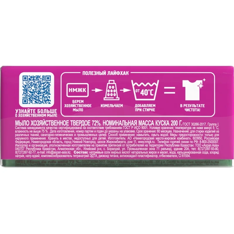 В его составе находятся активные компоненты, которые помогают сохранить белизну ткани и вернуть её потускневшим вещам. Мыло хорошо пенится в воде любой жёсткости и полностью смывается.