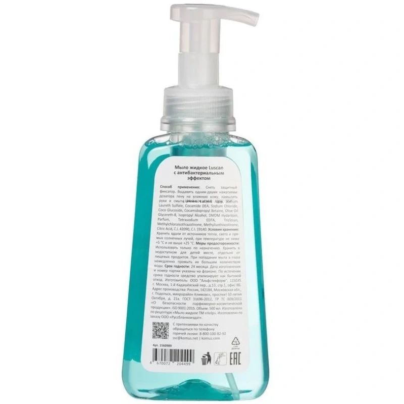 Назначение: мыло жидкое пенное Luscan антибактериальное предназначено для ежедневной гигиены рук в домашних условиях и в любых общественных местах. Антибактериальное мыло эффективно дезинфицирует и очищает, не пересушивая кожу. Специальная пенная формула увлажняет кожу. Мыло приятно пахнет, хорошо пенится и полностью смывается водой. Дозатор удобен в использовании дома, в офисе и в медицинских учреждениях.