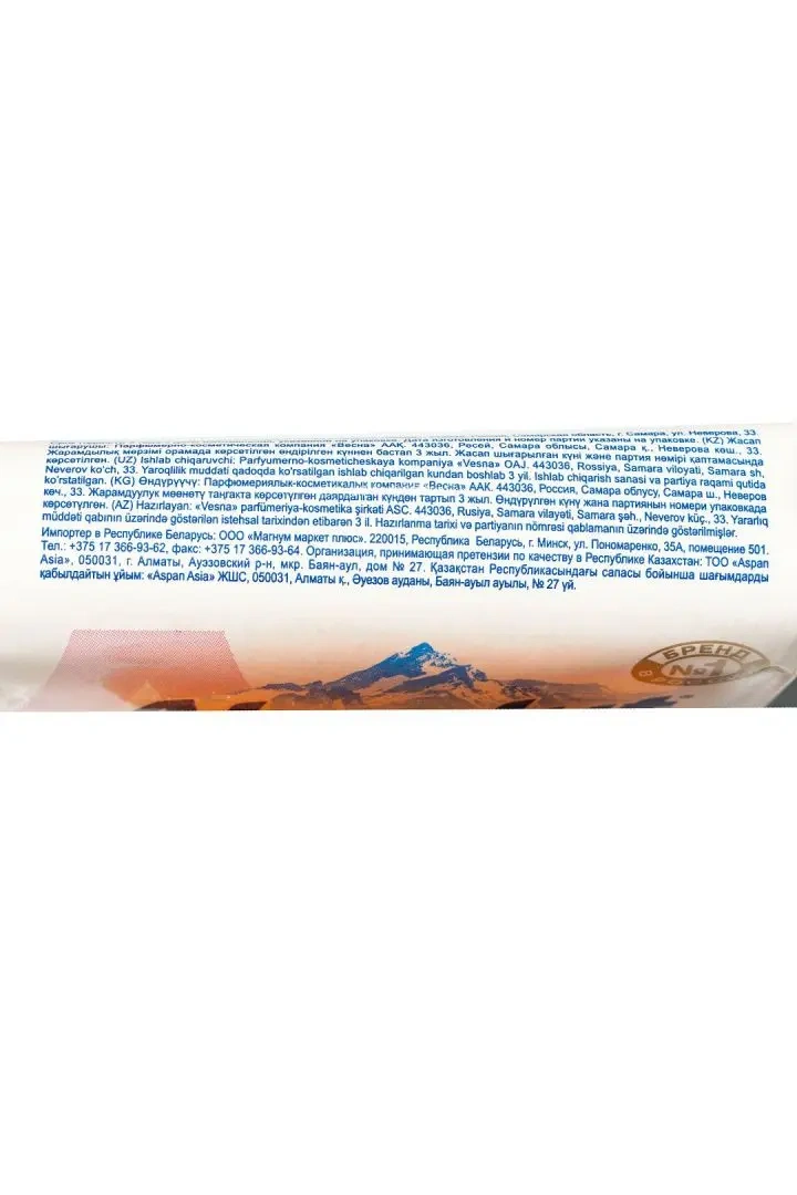 Состав: натриевые соли жирных кислот животных жиров, пальмового, кокосового или пальмоядрового масел, вода, глицерин, парфюмерная композиция (бензилсалицилат, бутилфенилметилпропиональ, цитронеллол, гексилциннамаль, лимонен, линалоол), хлорид натрия, антиоксидант-пластификатор, гидроксидихлордифениловый эфир, цинк пиритион, оптический отбеливатель, ЭДТА тетранатрия, гидроксид натрия, C.I. 77891, C.I. 74260.