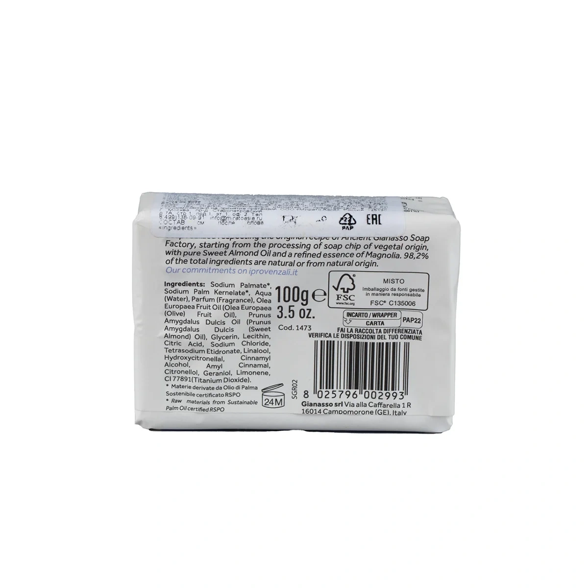 Мыло разработано по оригинальному рецепту мыловаренного завода Gianasso, начиная с обработки мыльной стружки растительного происхождения, чистым маслом сладкого миндаля и рафинированной эссенцией магнолии. 98,2% ингредиентов являются натуральными или натурального происхождения. Магнолии. Особенности состава: Без аммиака, Без красителей, Без парабенов, Гипоаллергенная, Вегетарианская косметика.