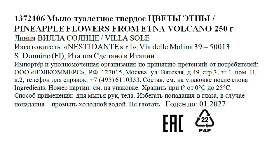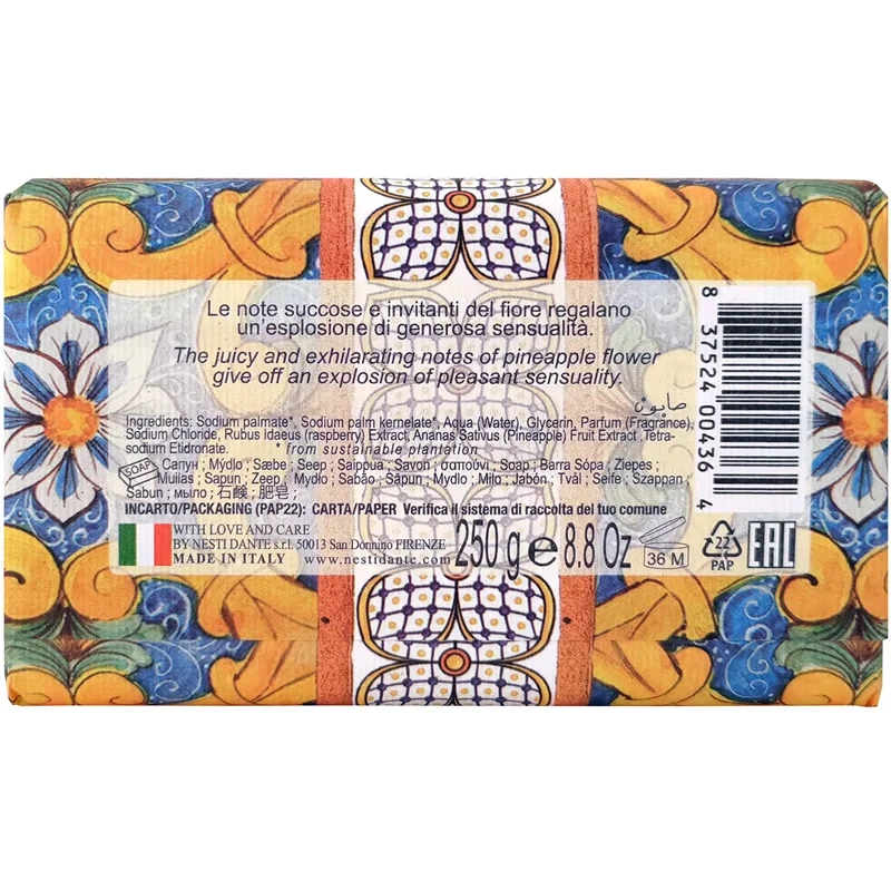Nesti Dante - экологически чистое мыло, обогащенное растительными экстрактами и маслами. Производится во Флоренции с 1947 года по старинной котловой технологии варки мыла. Без аллергенов и ингредиентов животного происхождения. Мыло не размокает и быстро восстанавливается после длительного контакта с водой. Сочные и волнующие ноты цветка ананаса создают взрыв приятной чувственности. Ананас – это кладезь витамина С, который еще называют витамином красоты. Витамин С необходимого для синтеза коллагена в нашем организме, обладает антиоксидантными свойствами. Экстракт малины (rubus idaeus raspberry extract) увлажняет и питает кожу.Мыло имеет нежный цветочный аромат.