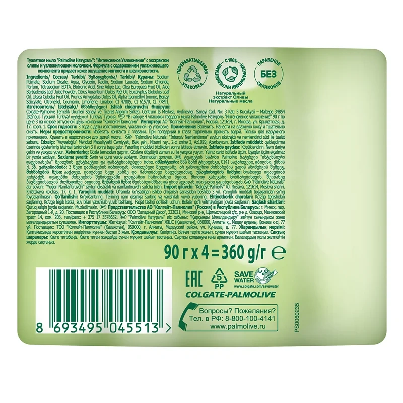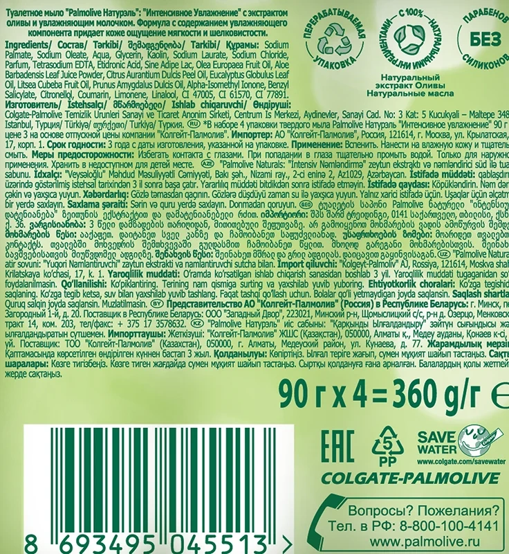 Мыло туалетное Palmolive Натурэль Интенсивное увлажнение (90г x 4шт), 360г