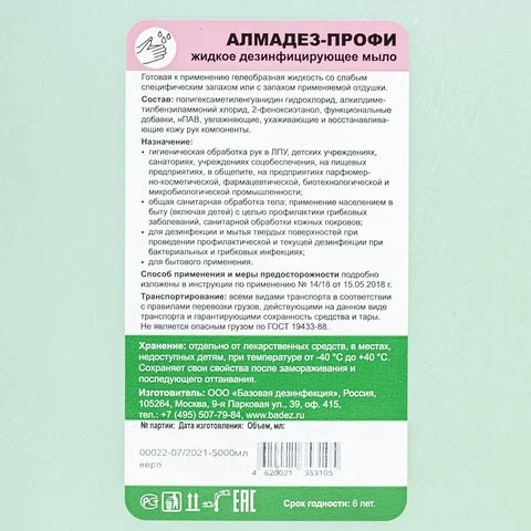 Мыло жидкое дезинфицирующее 5 л АЛМАДЕЗ-ПРОФИ, с пролонгированным антимикробным эффектом, МАП-87