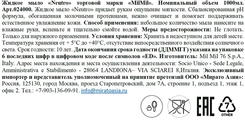 Мыло жидкое Milmil Neutro, 1л