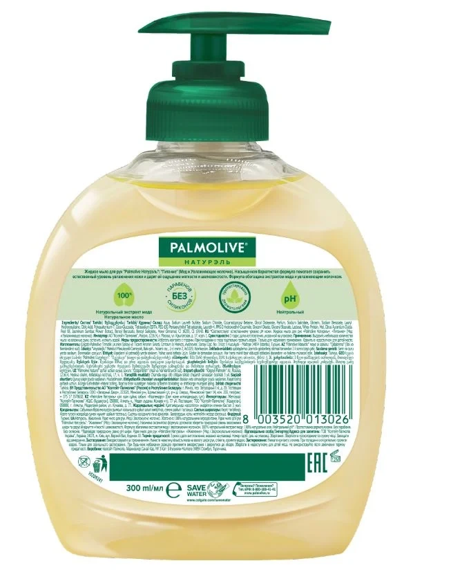 Эффективно очищает руки от загрязнений и избавляет от посторонних запахов. Создает антибактериальный барьер, защищающий кожу от вредного воздействия окружающей среды, хорошо увлажняет и питает кожу рук. Мед делает кожу нежной и мягкой, обладает омолаживающими свойствами и способствует заживлению ран. Увлажняющее молочко питает и восстанавливает кожу, избавляя от сухости и шелушения. Имеет нежный медовый аромат, хорошо пенится и легко смывается водой. Подходит для ежедневного использования. Экстракт меда, входящий в состав жидкого мыла Palmolive Натурэль, был секретом женской красоты с незапамятных времен. Благодаря своему уникальному составу мед с большим успехом используется как в домашней, так и в профессиональной косметологии.
