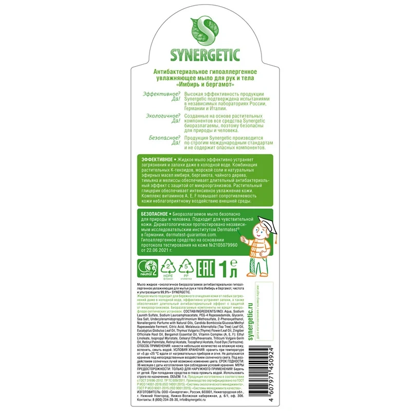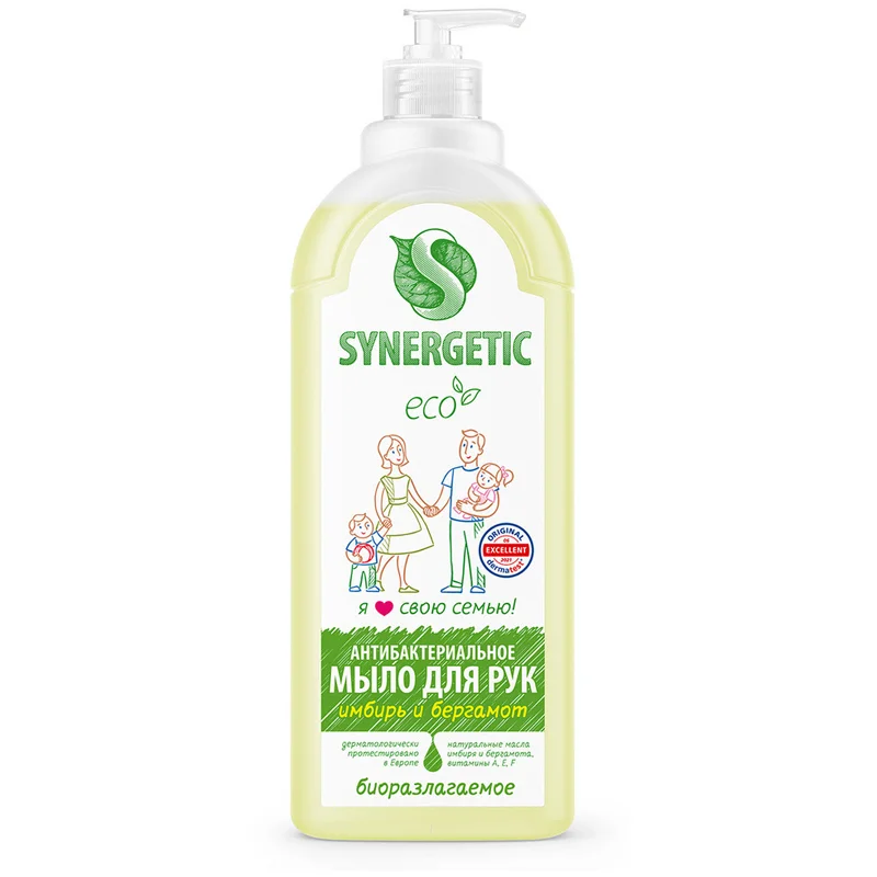 Антибактериальное увлажняющее жидкое мыло «Имбирь и бергамот» SYNERGETIC эффективно очищает кожу от любых загрязнений и запахов даже в холодной воде. Комбинация растительных К-тензидов, морской соли и натуральных эфирных масел имбиря, бергамота, чайного дерева, тимьяна и мелиссы обеспечивает длительный антибактериальный эффект с защитой от микроорганизмов. Растительный глицерин обеспечивает интенсивное увлажнение кожи. Комплекс витаминов A, E, F повышает сопротивляемость кожи неблагоприятному воздействию внешней среды. Мультифункциональный компонент натурального происхождения софоролипид мягко очищает и сохраняет естественный микробиом кожи. Гипоаллергенное жидкое мыло подходит для чувствительной кожи. Дерматологически протестировано независимым исследовательским институтом Dermatest®? в Германии. Биоразлагаемые компоненты не вредят микрофлоре септических установок.